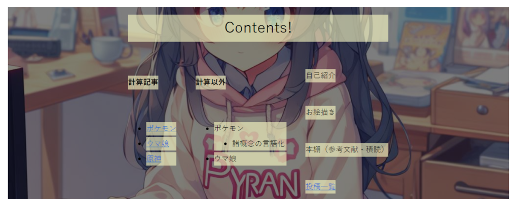 目次的な役割のぺーじなので先に他の記事を増やしていってから後で凝ったことしていきたいな。